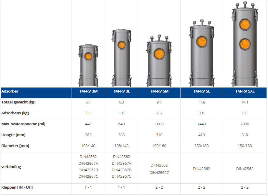 De Adsorber TM-RV zijn leverbaar met alle standaard aansluitingen voor transformatoren. Door de geoptimaliseerde structuur kunnen deze adsorbers zeer snel en goedkoop worden onderhouden. De slijtdelen of het pure droogmiddel worden snel ingebracht en de bescherming van het te ventileren systeem wordt hersteld.
